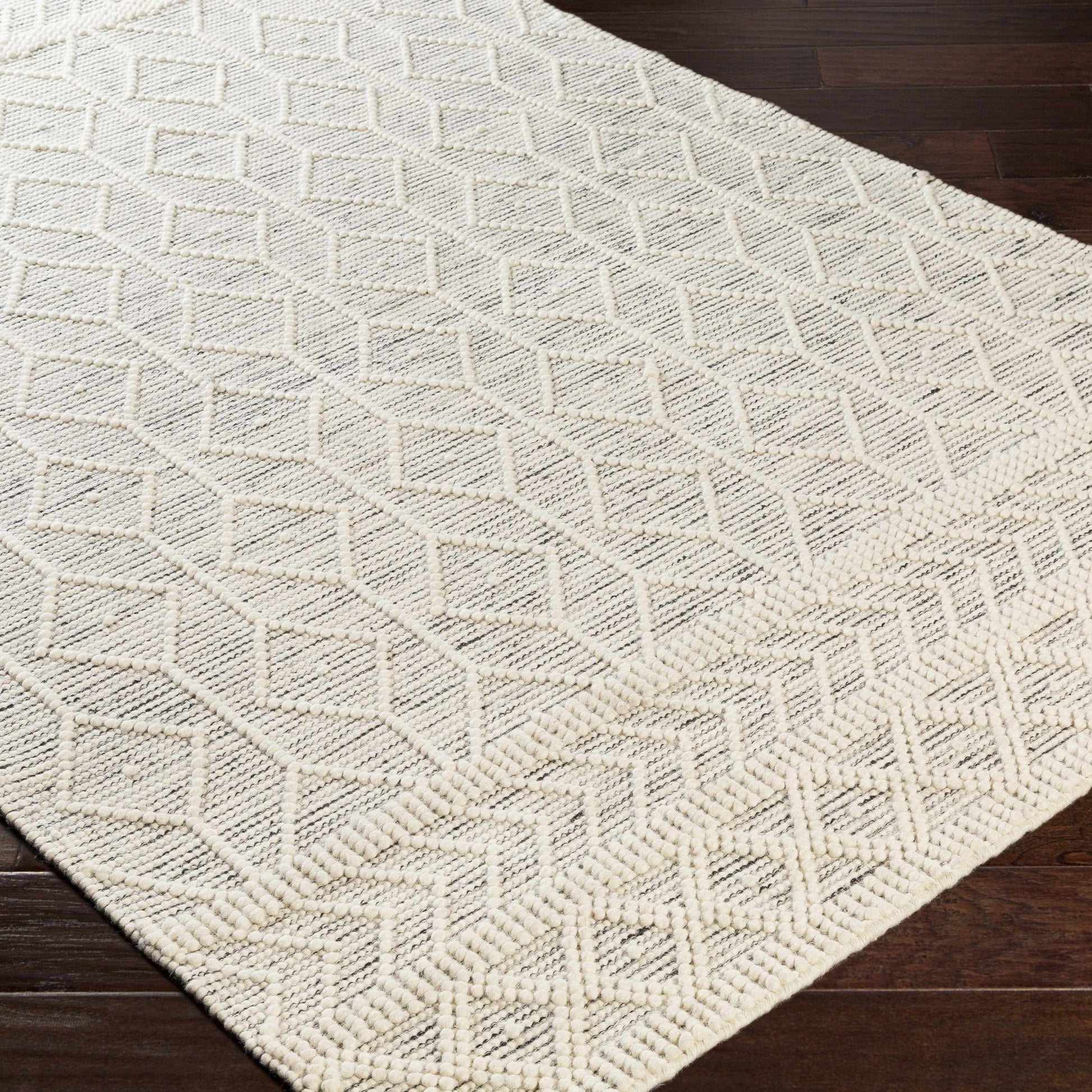 Transform your home with the Ivory Cove Rug, a hand-woven masterpiece crafted from 100% premium wool. Featuring a chic ivory-and-charcoal diamond pattern, its subtle high–low texture adds depth and dimension, creating a cozy yet sophisticated foundation for any room. Perfect for boho, farmhouse, or Scandinavian interiors, this rug delivers warmth, softness, and timeless style that elevates everyday living.